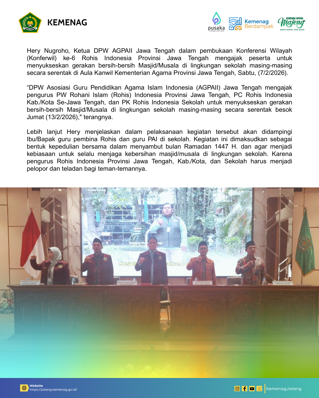 Semarang (Humas) — Hery Nugroho, Ketua DPW AGPAII Jawa Tengah dalam pembukaan Konferensi Wilayah (Konferwil) ke-6 Rohis Indonesia Provinsi Jawa Tengah mengajak peserta untuk menyukseskan gerakan bersih-bersih Masjid/Musala di lingkungan sekolah masing-masing secara serentak di Aula Kanwil Kementerian Agama Provinsi Jawa Tengah, Sabtu, (7/2/2026).