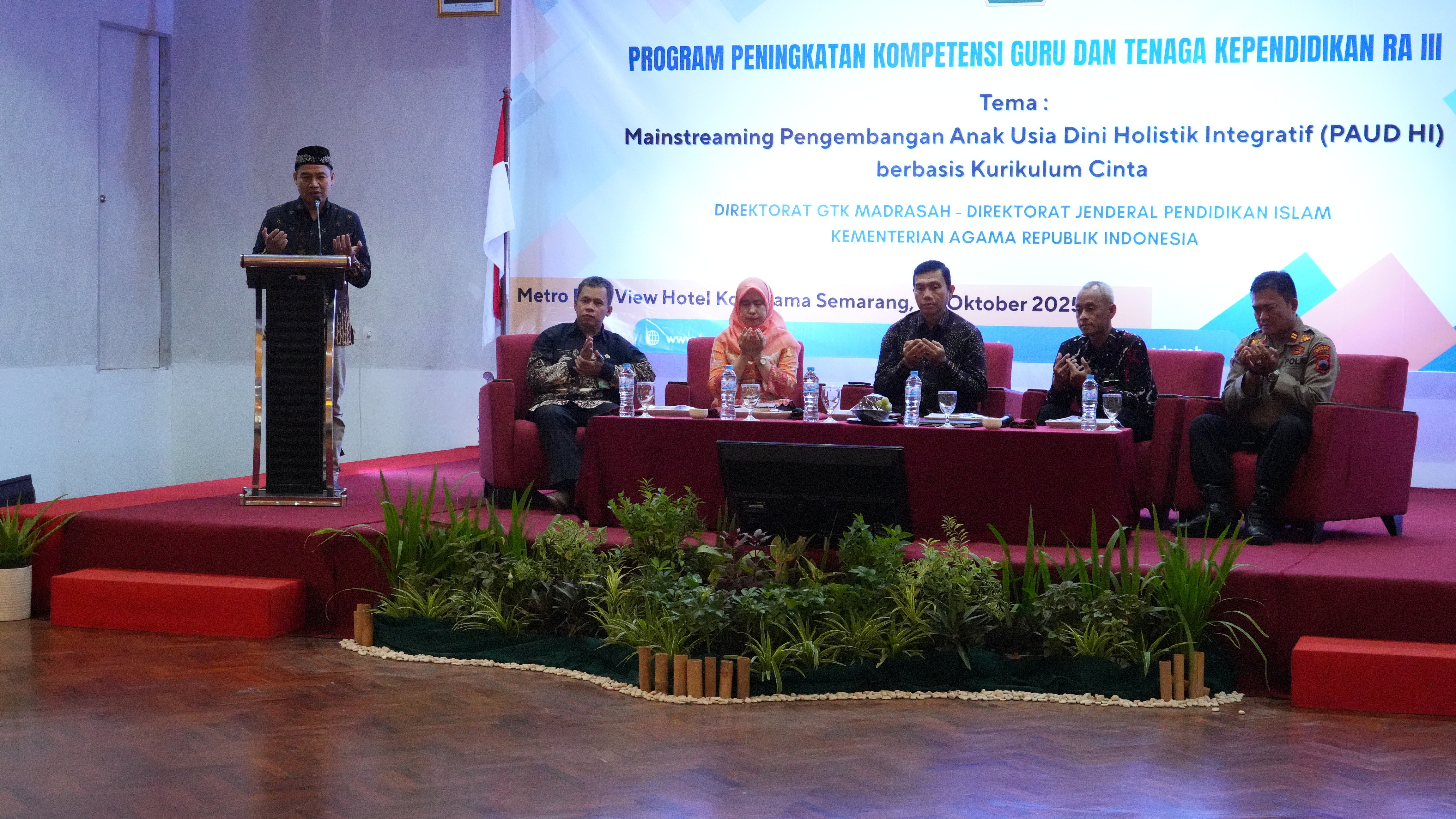 Semarang (Humas) — Direktorat Guru dan Tenaga Kependidikan (GTK) Madrasah menggelar kegiatan peningkatan kompetensi guru dan tenaga kependidikan RA tahap III dengan tema “Mainstreaming PAUD HI Berbasis Kurikulum Cinta”, bertempat di Metro Park View Hotel, Semarang, Jumat (24/10/2025).