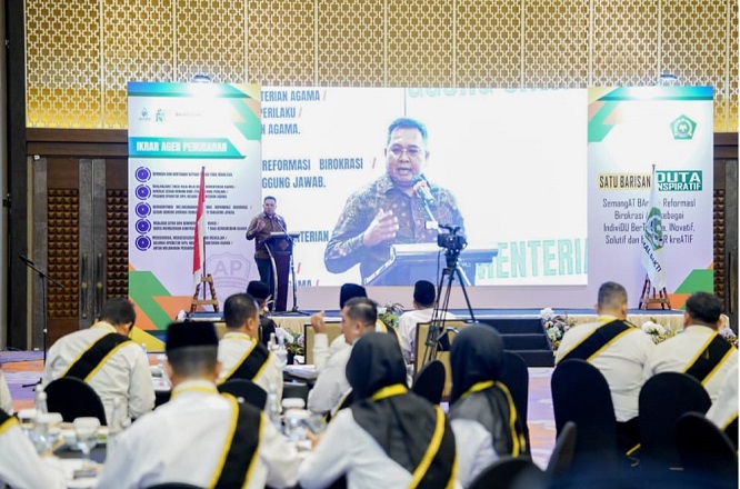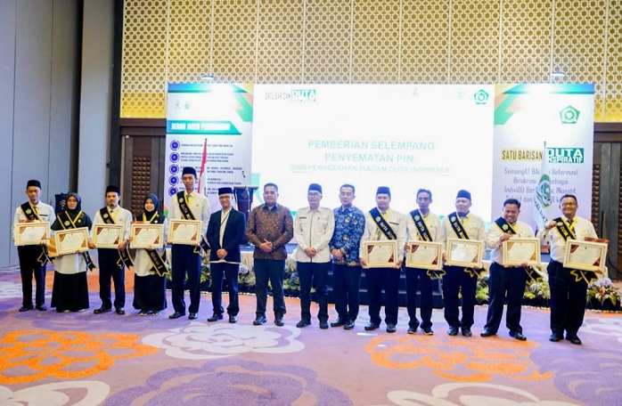Pati (Humas) — Faiz Affan menjadi satu-satunya guru MTsN Jawa Tengah yang menerima penghargaan Agen Perubahan dari Menteri Agama RI bersama 43 peserta lainnya. Penghargaan diberikan secara langsung oleh Plt. Kepala Biro Ortala Kemenag RI, Nurudin Selasa, (17/10) di Hotel Grand Mercure, Bandung. Nurudin, dalam kata sambutannya menyatakan bangga kepada para agen perubahan yang benar-benar telah menjadi mercusuar dan inspirator program di Kementerian Agama. “Ini bukan sekedar seremoni tapi membangun sistem nilai baru bagi Kementerian Agama. Kita sudah banyak perubahan dan bapak ibu adalah bagian di dalamnya,” ujarnya. “Kami terima kasih dan mohon diteruskan karena ke depan sangat dibutuhkan inspirator. Penghargaan pola Karir ASN juga kita terapkan,” lanjut Nurudin. Ia menegaskan, sebagai agen perubahan, sudah menjadi sebuah keharusan bisa membangun komunikasi dengan masyarakat dan stakeholder. Di samping itu juga harus membekali diri sebagai ASN yang berkualitas, dapat dipercaya, sikap penuh simpati pada lingkungan kerja, dan masyarakat. “Harus memiliki kemampuan komunikasi yang baik, inovasi kolaboratif, dalam berorganisasi tidak hidup sendiri, serta harus bisa membaca dinamika organisasi kita,” tegasnya. Mewakili Menteri Agama, Nurudin mengucapkan selamat kepada para penerima penghargaan agen perubahan saat ini. “Teruslah berkarya, untuk menunjukkan pengabdian di Kementerian Agama,” tandasnya. Berkat gagasan inovasi tentang digitalisasi madrasah (LMS pada Pembelajaran), Faiz telah berhasil mencanangkan agen perubahan di MTsN 1 Pati seiring dengan dicetuskannya program International Digital Class (IDC) di MTsN 1 Pati. LMS atau Learning Management System merupakan sebuah perangkat lunak yang khusus dirancang untuk melakukan distribusi, membuat, dan melakukan pengaturan terhadap konten pembelajaran. “LMS itu portal KBM online, termasuk e-book. Jadi, jadwal, tugas, materi, kehadiran dan lain sebagainya ada disatu LMS itu, khususnya untuk kelas digital MTsN 1 Pati,” terangnya. Dengan diterimanya penghargaan ini, Faiz berharap program yang ia canangkan dapat terealisasikan dengan baik untuk sebuah perubahan. “Semoga program digitalisasi madrasah, khususnya pada LMS dan pmbelajaran di kelas juga pelatihan-pelatihan SDM guru bisa terealisasikan dengan baik, dengan komitmen bersama untuk perubahan,” harapnya. Ali Musyafak, Kepala MTsN 1 Pati merasa bahagia sekaligus bersyukur saat menyaksikan penyerahan penghargaan, pasalnya gurunya terpilih menjadi agen perubahan dan merupakan satu-satunya penerima dari MTs se-Jawa Tengah.(am/at/Sua)