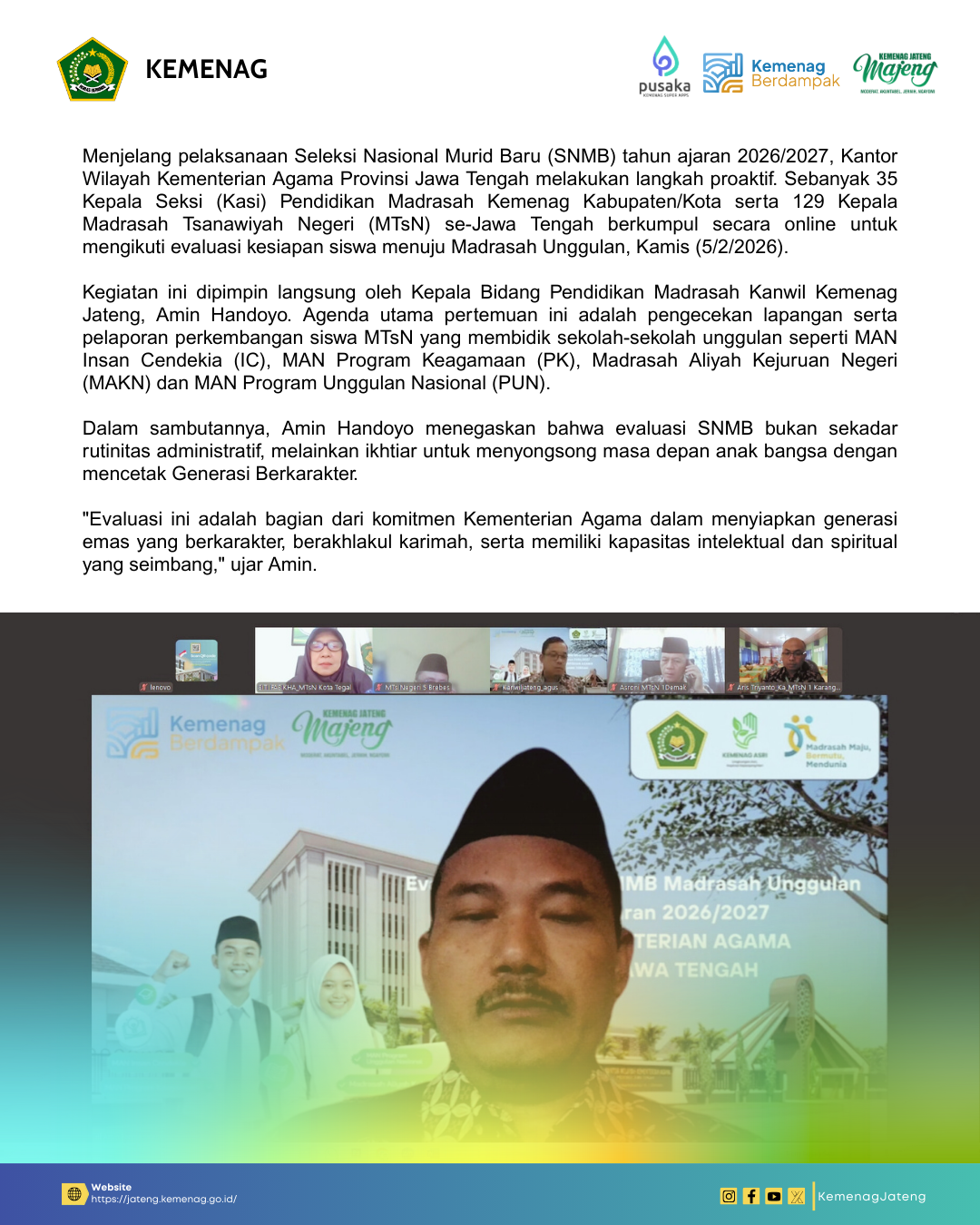 Semarang (Humas) – Menjelang pelaksanaan Seleksi Nasional Murid Baru (SNMB) tahun ajaran 2026/2027, Kantor Wilayah Kementerian Agama Provinsi Jawa Tengah melakukan langkah proaktif. Sebanyak 35 Kepala Seksi (Kasi) Pendidikan Madrasah Kemenag Kabupaten/Kota serta 129 Kepala Madrasah Tsanawiyah Negeri (MTsN) se-Jawa Tengah berkumpul secara online untuk mengikuti evaluasi kesiapan siswa menuju Madrasah Unggulan, Kamis (5/2/2026).