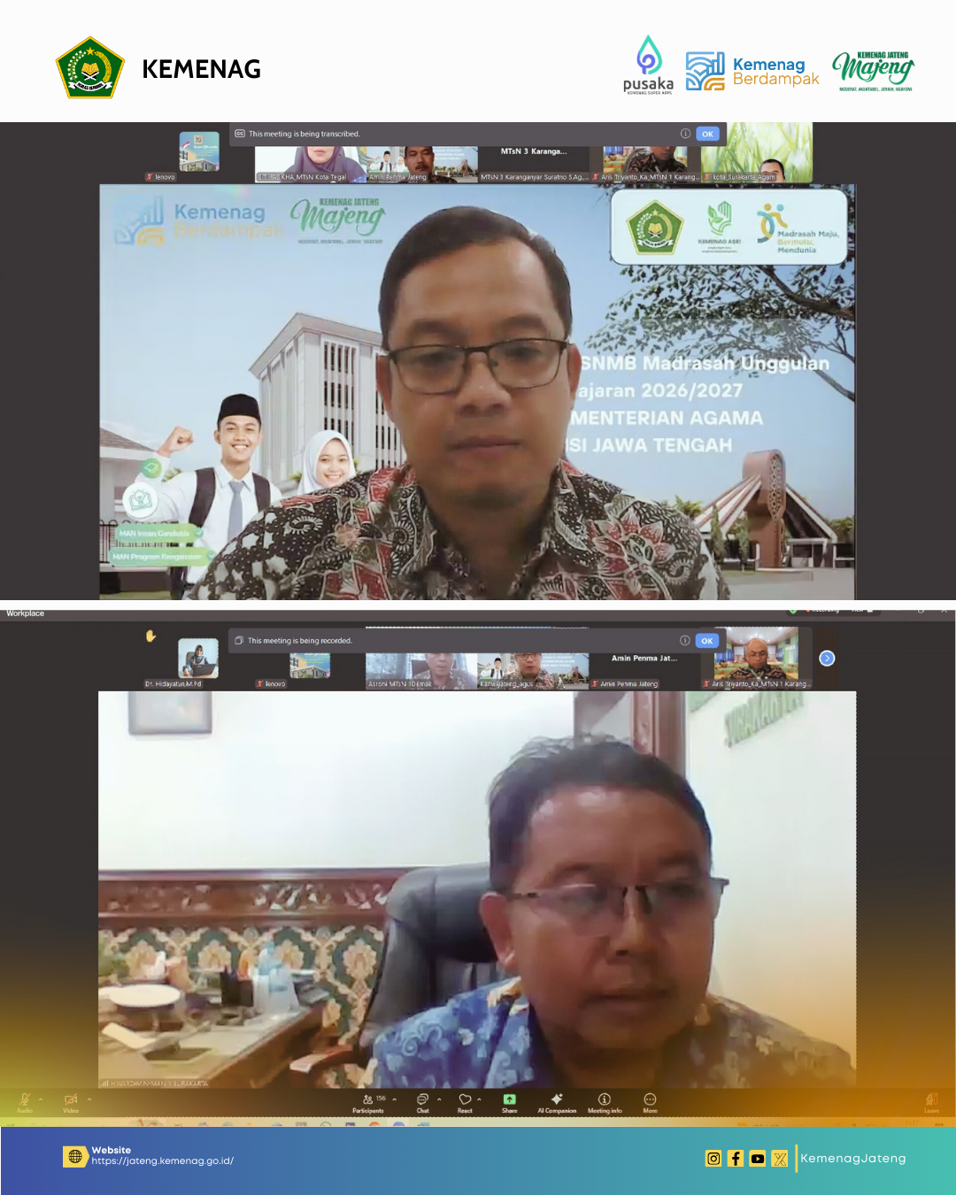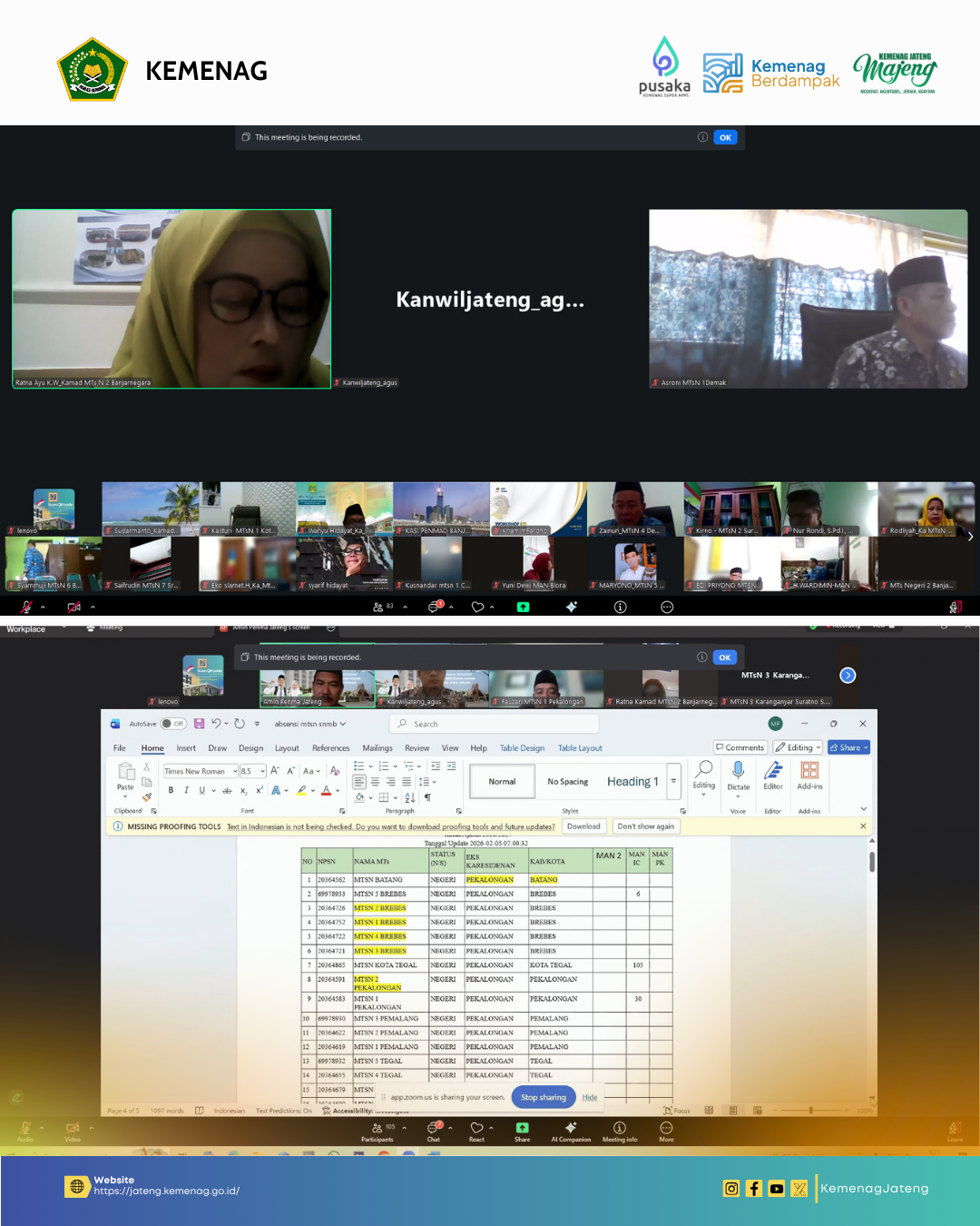 Semarang (Humas) – Menjelang pelaksanaan Seleksi Nasional Murid Baru (SNMB) tahun ajaran 2026/2027, Kantor Wilayah Kementerian Agama Provinsi Jawa Tengah melakukan langkah proaktif. Sebanyak 35 Kepala Seksi (Kasi) Pendidikan Madrasah Kemenag Kabupaten/Kota serta 129 Kepala Madrasah Tsanawiyah Negeri (MTsN) se-Jawa Tengah berkumpul secara online untuk mengikuti evaluasi kesiapan siswa menuju Madrasah Unggulan, Kamis (5/2/2026).