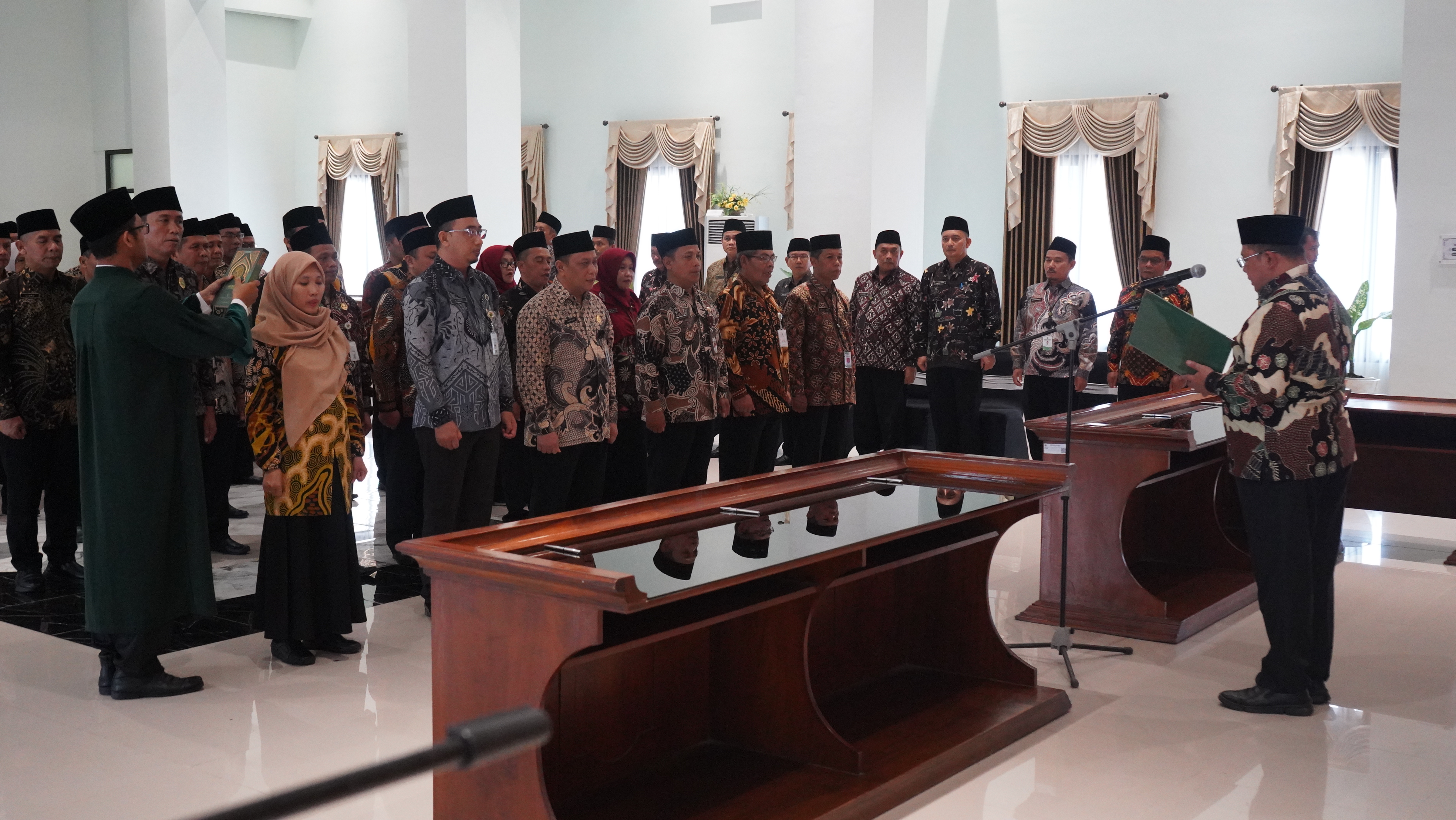 Semarang (Humas) – Kantor Wilayah Kementerian Agama Provinsi Jawa Tengah menggelar pelantikan dan pengambilan sumpah jabatan pengawas di Auditorium Majeng pada Selasa (23/9/2025). Acara dipimpin langsung oleh Kakanwil Kemenag Jateng, Saiful Mujab, dengan disaksikan Kabag TU Wahid Arbani, para Kepala Bidang (Kabid), dan para Pembimas.