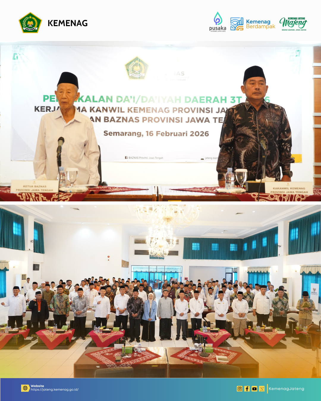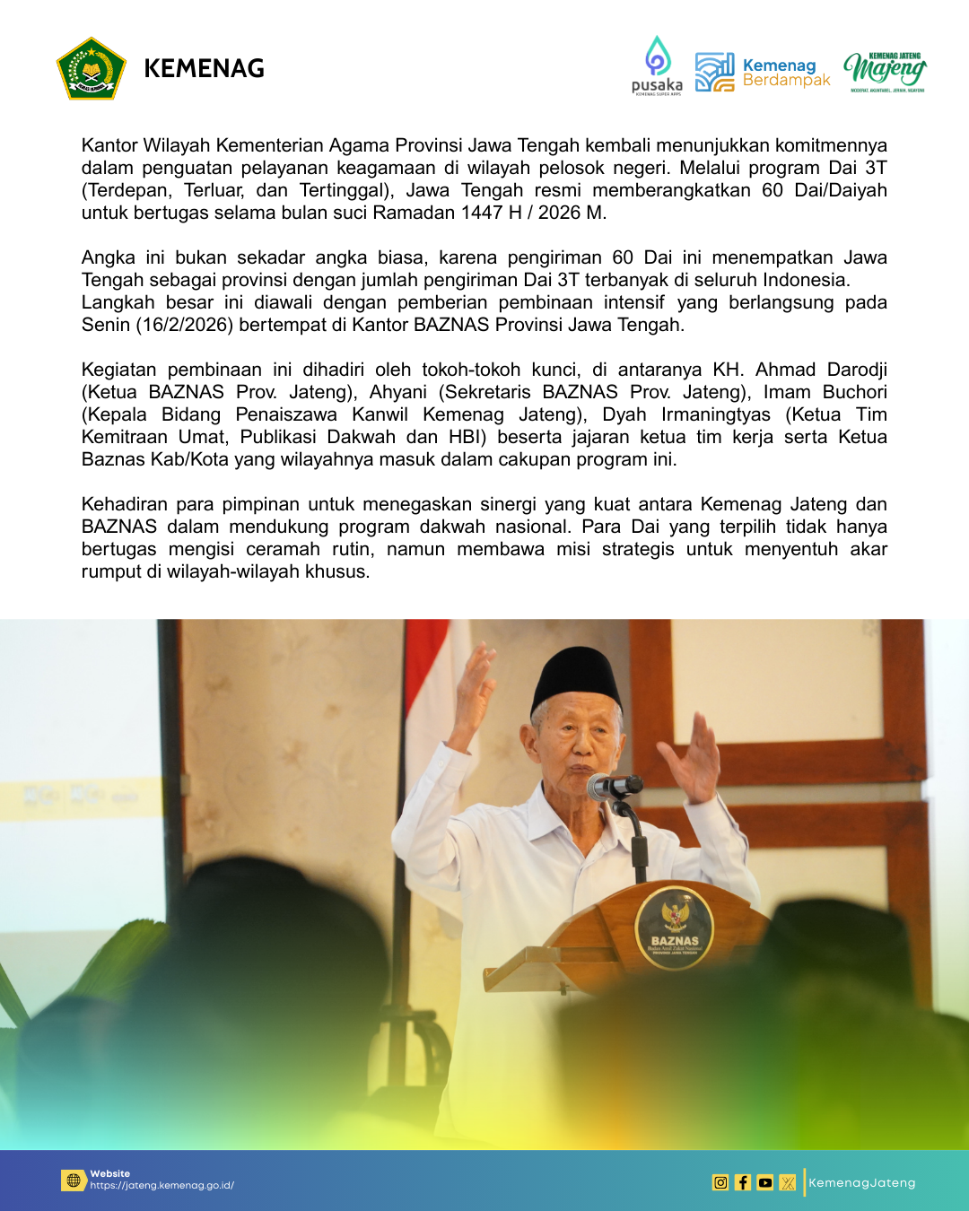 Angka ini bukan sekadar angka biasa, karena pengiriman 60 Dai ini menempatkan Jawa Tengah sebagai provinsi dengan jumlah pengiriman Dai 3T terbanyak di seluruh Indonesia. Langkah besar ini diawali dengan pemberian pembinaan intensif yang berlangsung pada Senin (16/2/2026) bertempat di Kantor BAZNAS Provinsi Jawa Tengah.