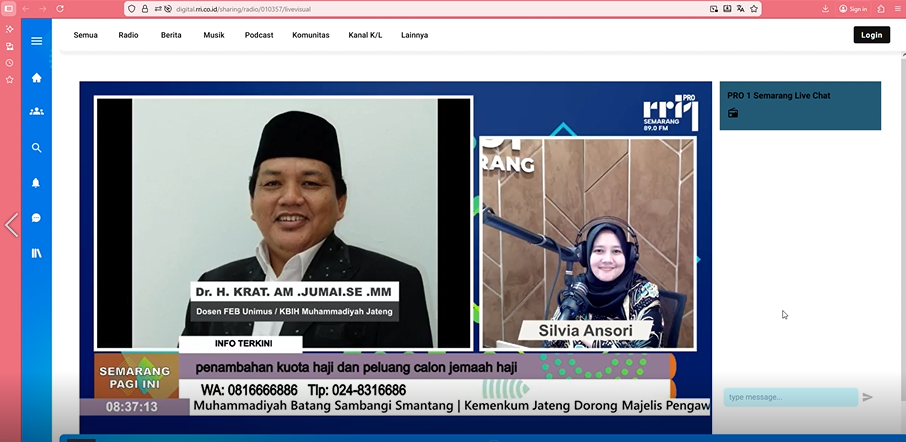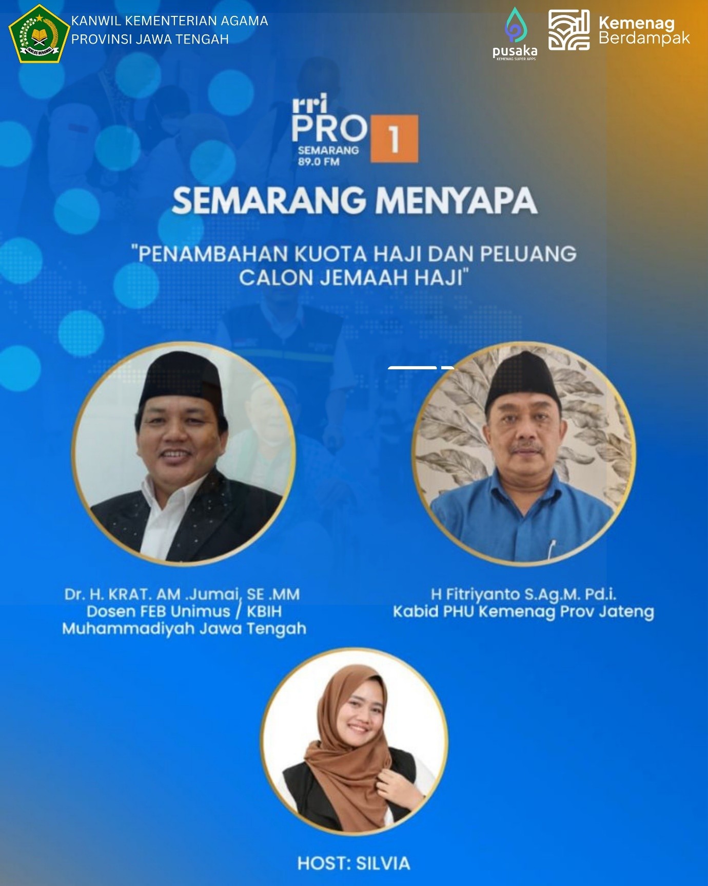 Semarang (Humas) – Sebelum adanya revisi Undang-Undang Haji, dahulu pembagian kuota jemaah haji reguler berdasarkan proporsi jumlah penduduk muslim di suatu Provinsi, dengan adanya revisi Undang-Undang penentuan kuota haji sekarang berbasis waitinglist/ daftar tunggu pendaftar haji reguler di Provinsi tersebut. Apabila di Provinsi tersebut waitinglist pendaftar hajinya banyak, otomatis mendapatkan kuota lebih banyak. Hal ni disampaikan Kepala Bidang Penyelenggaraan Haji dan Umrah (Kabid PHU) Kantor Wilayah Kementerian Agama (Kanwil Kemenag) Provinsi Jawa Tengah dalam acara “Semarang Menyapa” yang disiarkan RRI (Radio Republik Indonesia) Pro Semarang melalui radio maupun kanal platform digital.
