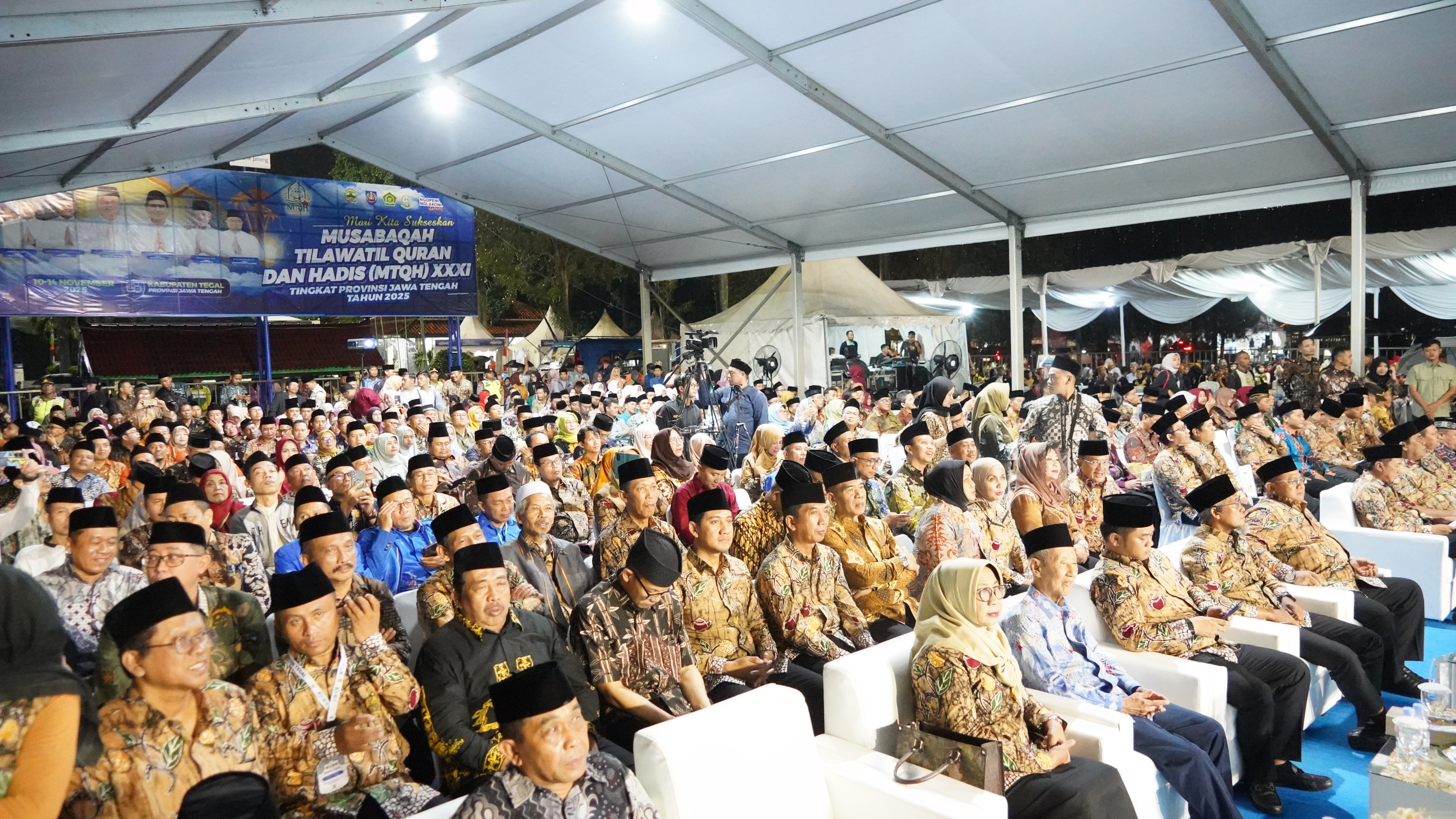 Tegal (Humas) — Pembukaan Musabaqah Tilawatil Qur’an dan Hadis (MTQH) XXXI Tingkat Provinsi Jawa Tengah berlangsung meriah di halaman Kantor Bupati Tegal, Senin (10/11/2025). Meski hujan mengguyur sejak pagi, semangat para peserta dan tamu undangan tetap tinggi menghadiri acara keagamaan bergengsi yang diikuti oleh Sekda Provinsi Jawa Tengah, Bupati/Wali Kota se-Jawa Tengah, Kepala Kemenag se-Jawa Tengah, para Kepala OPD, serta kontingen dari 35 Kabupaten/Kota se-Jawa Tengah.