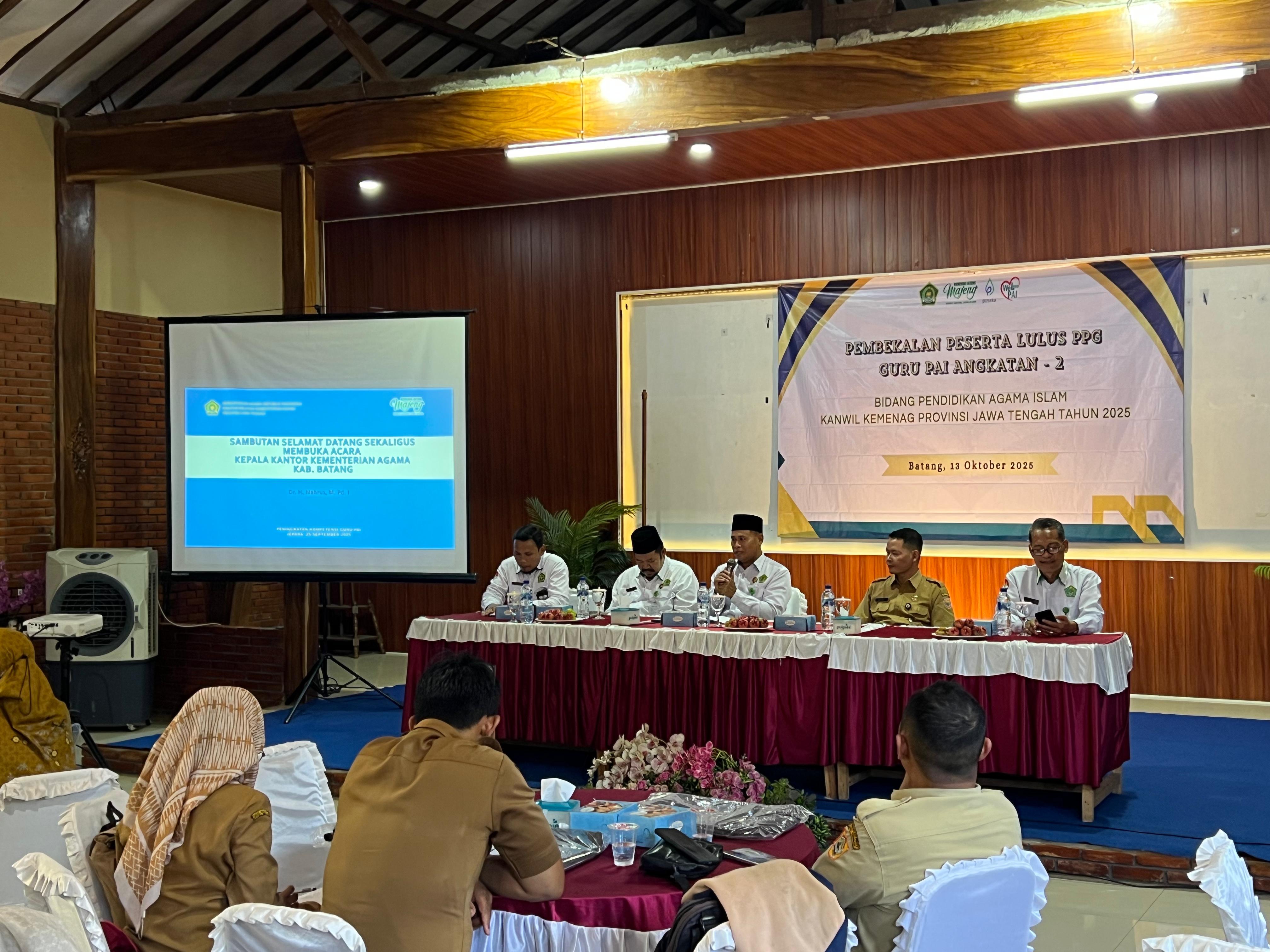Batang (Humas) – Bidang Pendidikan Agama Islam (PAI) Kantor Wilayah Kementerian Agama Provinsi Jawa Tengah menggelar kegiatan Pembekalan bagi Peserta Lulus Pendidikan Profesi Guru (PPG) bagi Guru Pendidikan Agama Islam. Kegiatan ini dilaksanakan pada hari Senin, 13/10/2025, bertempat di Rumah Makan Tirta Asri, Sempu, Limpung, Batang.