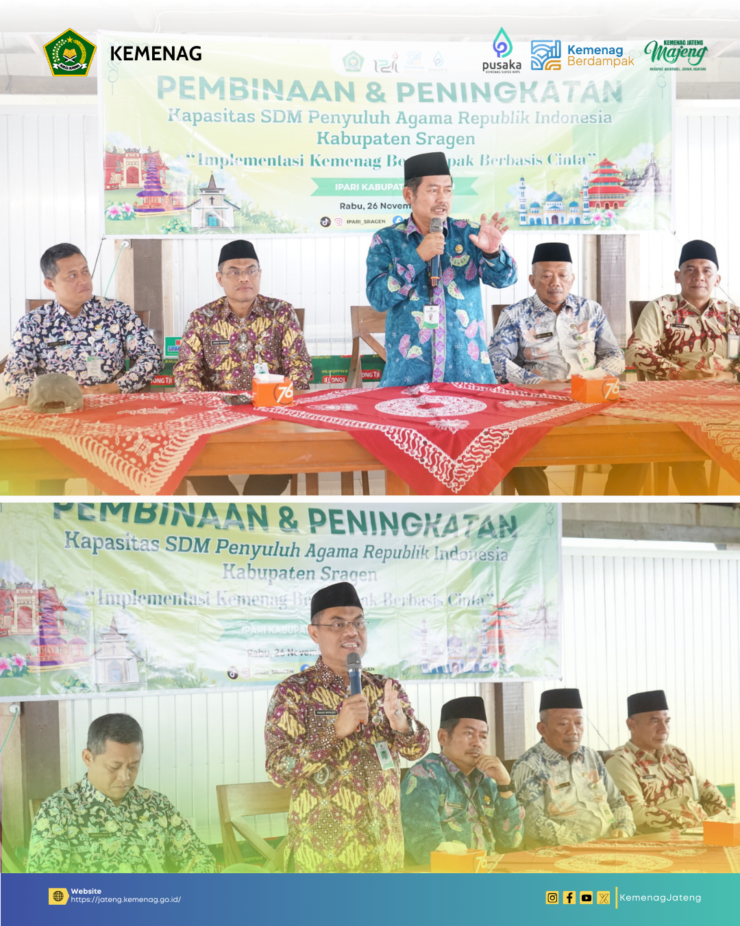 Kepala Kantor Kementerian Agama (Kemenag) Kabupaten Sragen, Ihsan Muhadi, hadir sebagai pemateri menyoroti pentingnya profesionalitas dan peningkatan kapasitas penyuluh dalam mewujudkan program Kemenag Berdampak, yang harus dilaksanakan dengan pendekatan humanis, moderat, dan berbasis kelembutan hati.