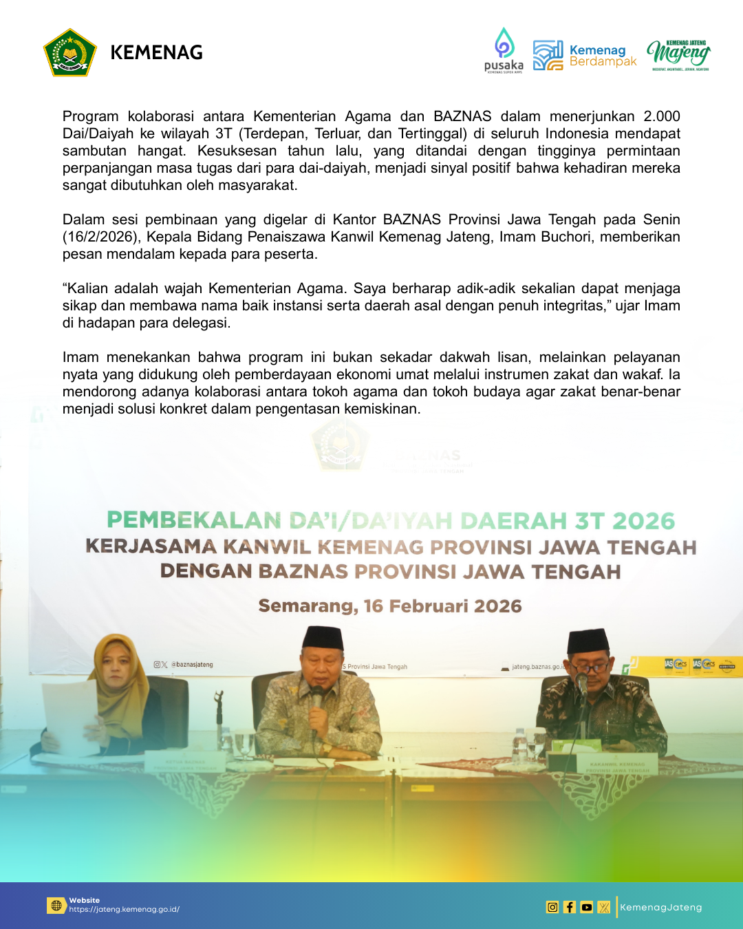 Semarang (Humas) – Program kolaborasi antara Kementerian Agama dan BAZNAS dalam menerjunkan 2.000 Dai/Daiyah ke wilayah 3T (Terdepan, Terluar, dan Tertinggal) di seluruh Indonesia mendapat sambutan hangat. Kesuksesan tahun lalu, yang ditandai dengan tingginya permintaan perpanjangan masa tugas dari para dai-daiyah, menjadi sinyal positif bahwa kehadiran mereka sangat dibutuhkan oleh masyarakat.