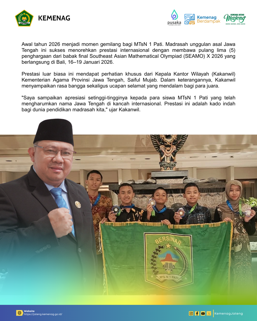 Prestasi luar biasa ini mendapat perhatian khusus dari Kepala Kantor Wilayah (Kakanwil) Kementerian Agama Provinsi Jawa Tengah, Saiful Mujab. Dalam keterangannya, Kakanwil menyampaikan rasa bangga sekaligus ucapan selamat yang mendalam bagi para juara.