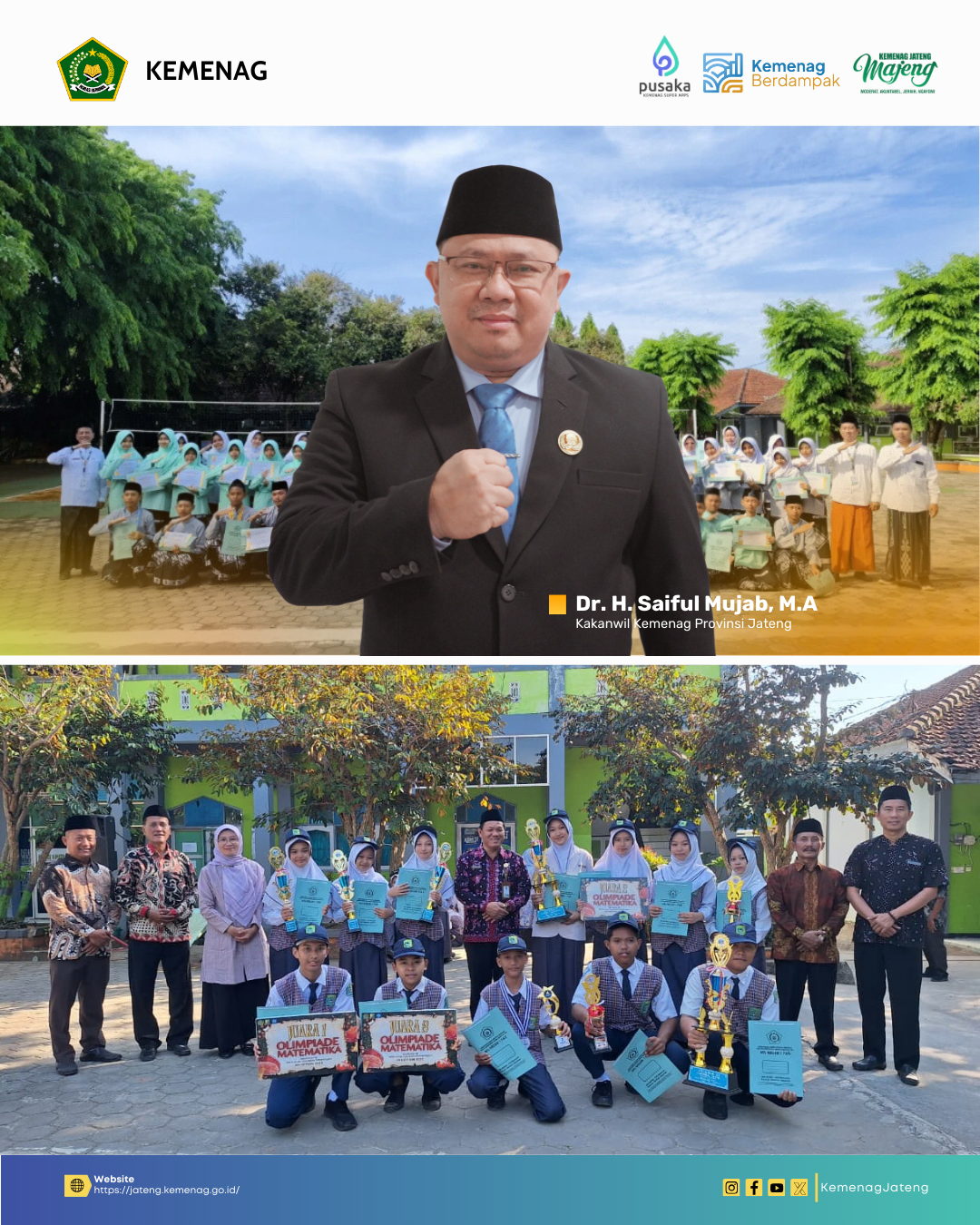 ” Mari kita buktikan bahwa Madrasah bukan lagi sekadar pilihan alternatif, melainkan lembaga pendidikan utama yang mampu mencetak generasi emas dengan standar prestasi nasional bahkan internasional. Selamat kepada MTsN 1 Pati, teruslah bergerak maju dan jangan cepat berpuas diri.” Tegasnya.