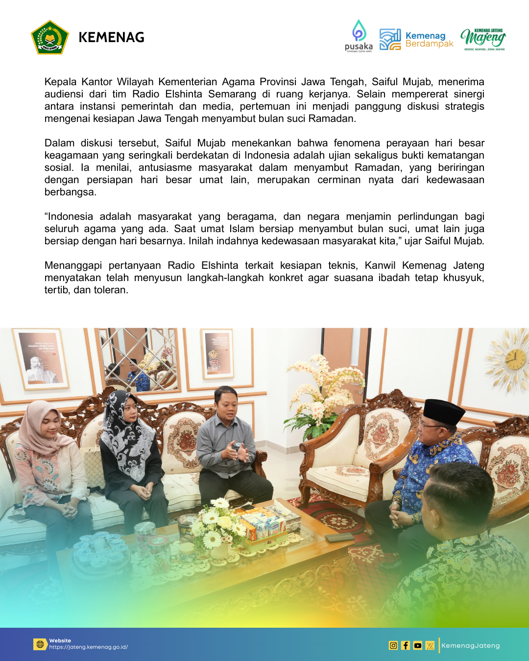 Semarang (Humas) – Kepala Kantor Wilayah Kementerian Agama Provinsi Jawa Tengah, Saiful Mujab, menerima audiensi dari tim Radio Elshinta Semarang di ruang kerjanya. Selain mempererat sinergi antara instansi pemerintah dan media, pertemuan ini menjadi panggung diskusi strategis mengenai kesiapan Jawa Tengah menyambut bulan suci Ramadan.